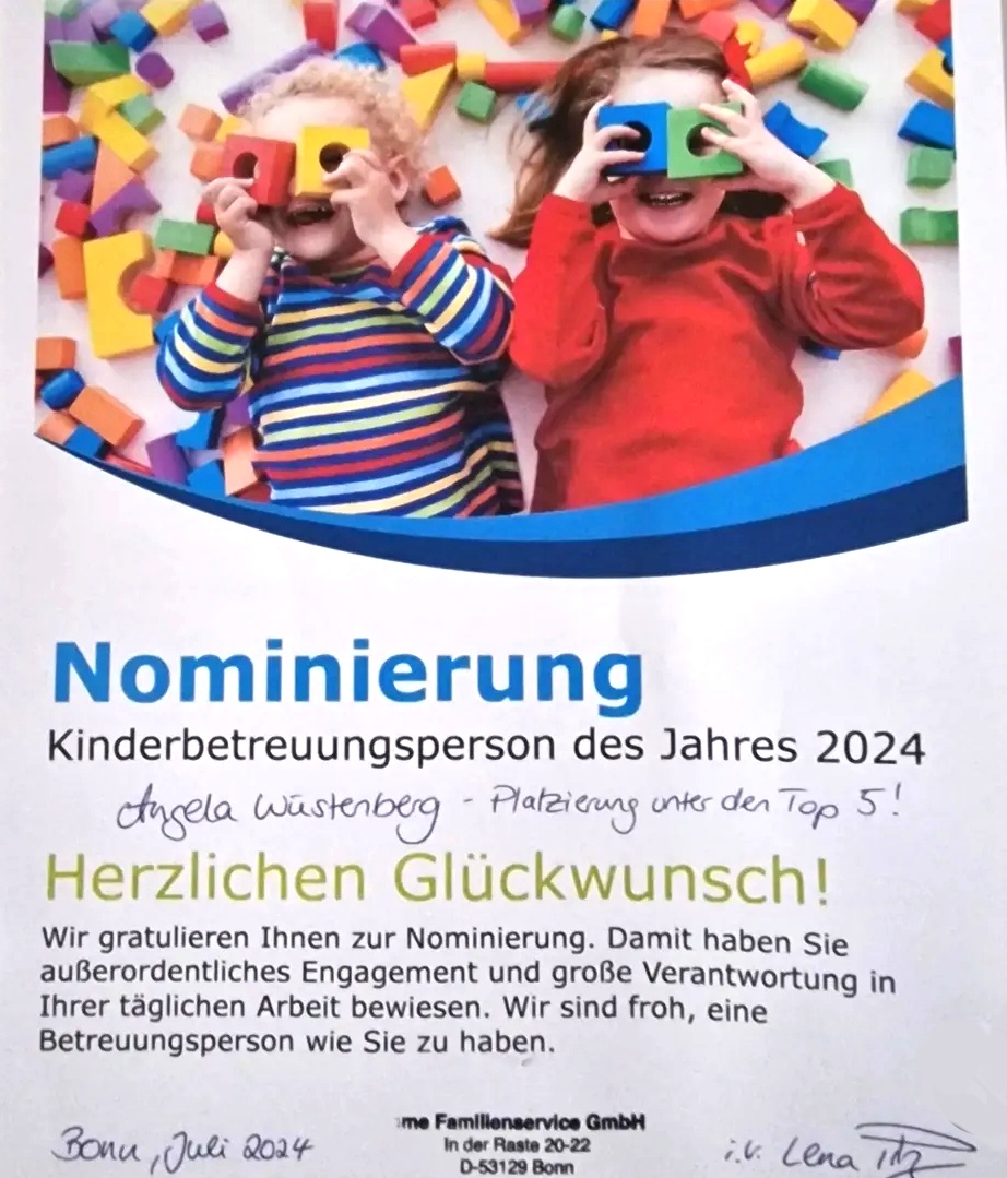 Nominierung bei der bundesweiten Aktion vom PME Familienservice zur Kindertagespflegeperson 2024 - unter den fünf letzten Plätzen gelandet. Herzlichen Dank an PME