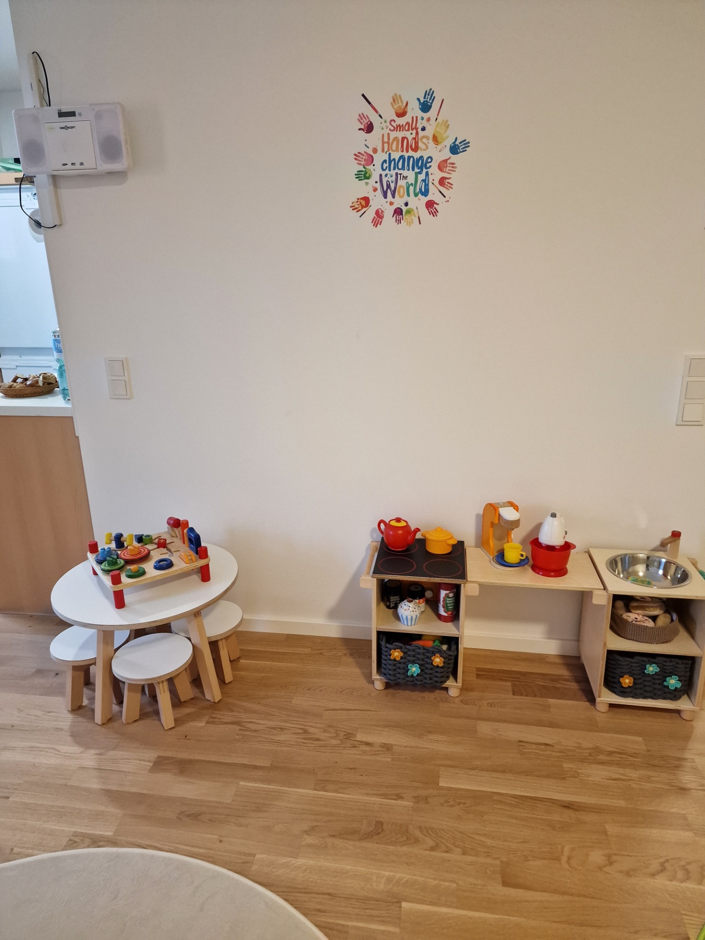 Ein großes Spielzimmer inkl. offenem Küchenbereich ist das Herzstück des BärenKörbles, hier darf nach Herzenslust gespielt und getobt werden. Dieser Bereich wird abwechselnd mit neuen Förder-, Bildungs- und Spielmöglichkeiten wie Forschungsprojekten, diversen Materialien wie Alltags.-, Küchenutensilien, Autos, Puppen, Maltisch, Bällchen Bad, Bausteinen, Montessori Projekten und lebendigen Lesegeschichten etc. gestaltet.